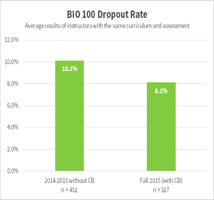 One course, Biology 100, delivered as blended learning, was examined in detail. The students did the adaptive work on the CogBooks platform then brought that knowledge to class, where group work and teaching took place – a flipped classroom model. This data was presented at the Educause Learning Initiative in San Antonio in February and is impressive.